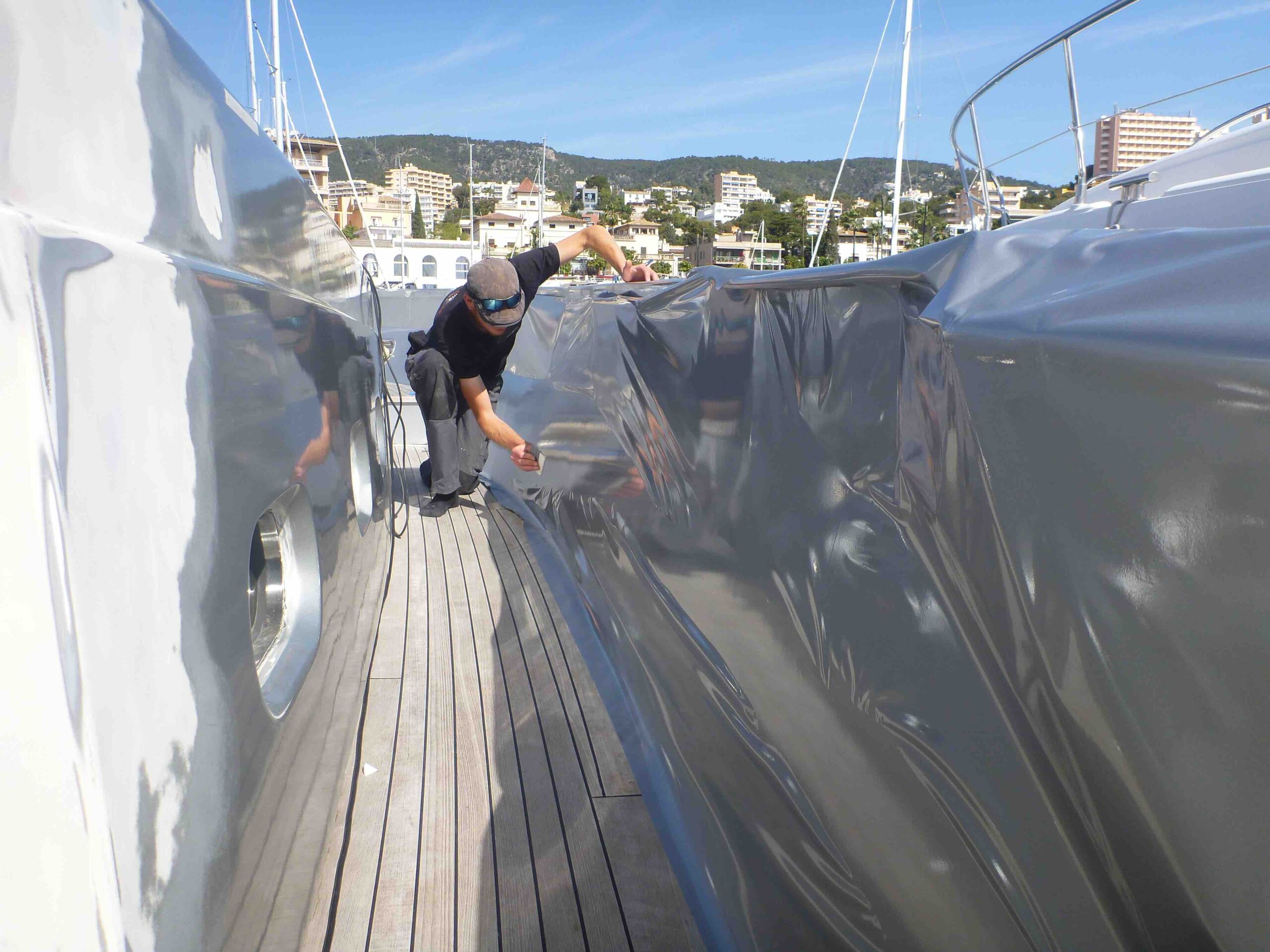 Πρόκειται για την εφαρμογή ειδικά σχεδιασμένων, υψηλής ποιότητας μεμβρανών βινυλίου στην εξωτερική επιφάνεια του σκάφους. Αυτές οι μεμβράνες διατίθενται σε μια απίστευτη ποικιλία χρωμάτων, υφών (ματ, γυαλιστερό, μεταλλικό, σατέν, ακόμα και απομιμήσεις ξύλου ή ανθρακονήματος) και σχεδίων, επιτρέποντας την πλήρη προσαρμογή στην αισθητική που επιθυμείτε.