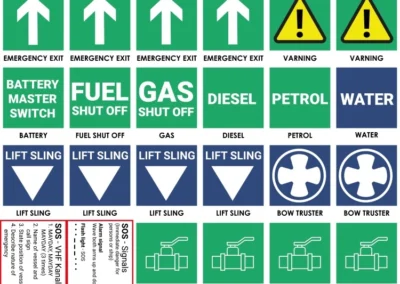 - Οδηγίες Έκτακτης Ανάγκης: Υποδεικνύουν τη θέση σωστικών μέσων (π.χ., “Εξοπλισμός Πυρόσβεσης”, “Σωσίβια”), εξόδων κινδύνου ή κουμπιών έκτακτης διακοπής.